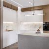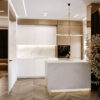 Kuchnia w lakierze z białymi i złotymi frontami. Styl nowoczesny i nowojorski. Blaty mogą byc wykonany z konglomeratu lub z laminatu i HPL.
